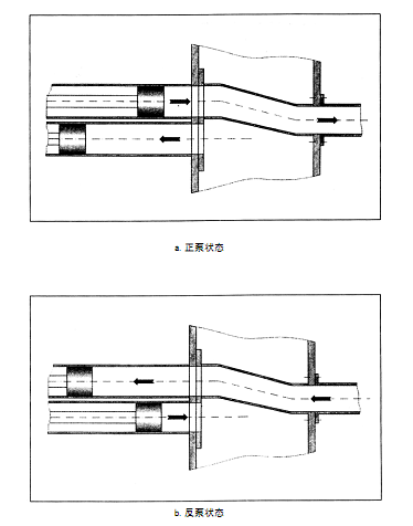 當混凝土活塞8后退至行程終端時,觸發水箱3中的換向裝置4,主油缸1、2換向,同時擺動油缸12、13換向,使分配閥10與混凝土缸6連通,混凝土缸5與料斗連通,這時活塞7后退,8前進。如此循環,從而實現連續泵送。反泵時,通過反泵操作,使處在吸入行程的混凝土缸與分配閥連通,處在推送行程的混凝土缸與料斗連通,從而將管路中的混凝土抽回料斗(如圖所示)