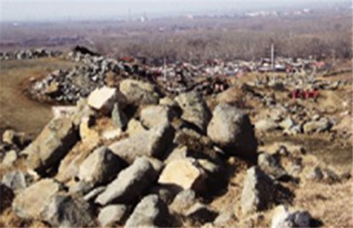 記者沿著一條路進入采石場看到,開采較規(guī)則的石頭被裝入容積1立方米的木框里,但更多的是,開采過后,在近百畝的地面上,高低不平地散落著大小不一的石頭,有些地方,因為挖石頭,形成10多米深的溝壑。
